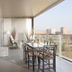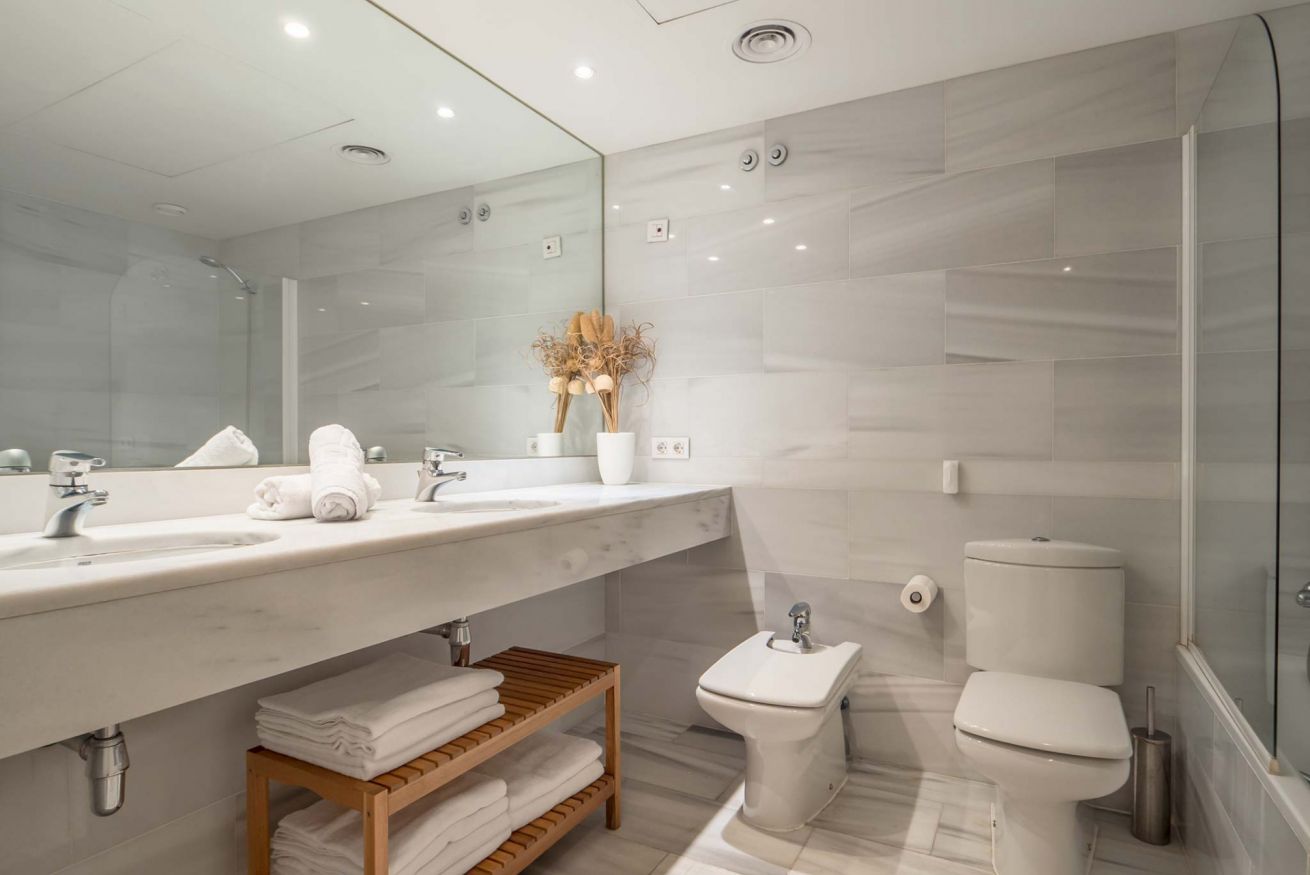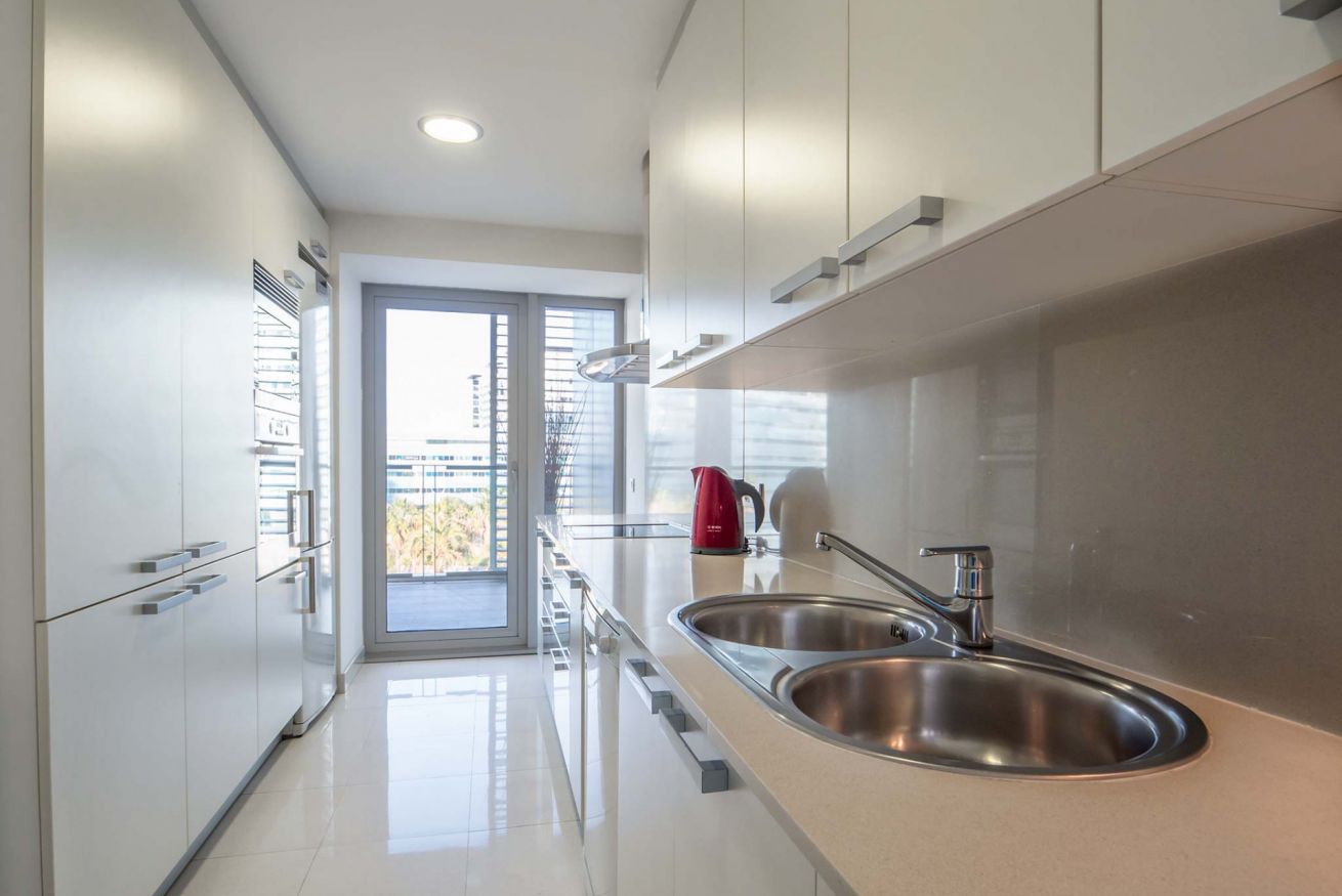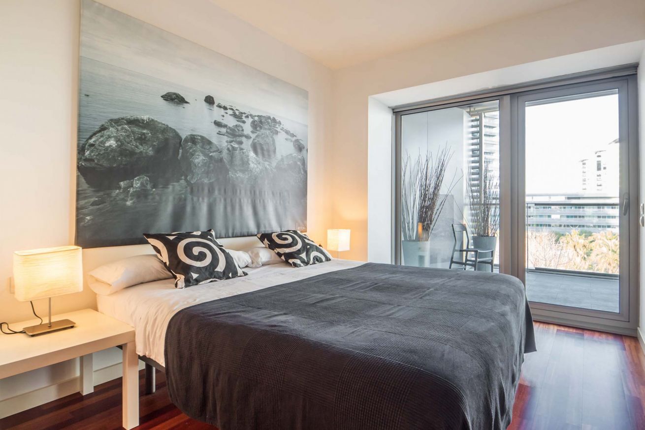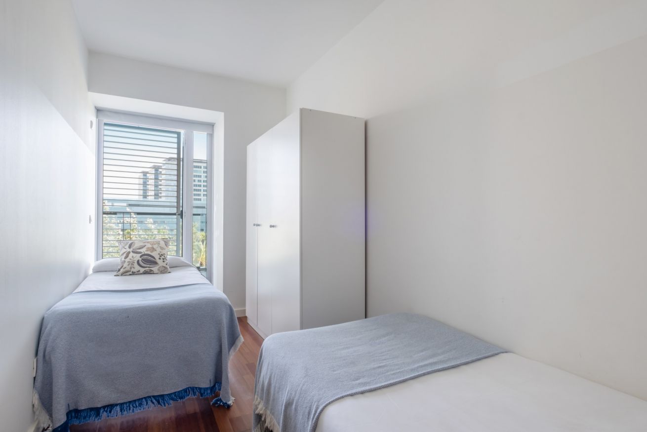 El apartamento es tranquilo y minimalista gracias a las tonalidades neutras y a la abundancia de luz natural. Tiene 2 habitaciones, una de matrimonio y otra con dos camas individuales, y dos cuartos de baños, uno en suite. La sala de estar es particularmente luminosa gracias a las puertas y ventanales que conducen a la amplia terraza perfecta para disfrutar de una relajada cena. Si viajas a Barcelona en coche, el complejo dispone de plazas de parking y vigilancia las 24 horas del día.